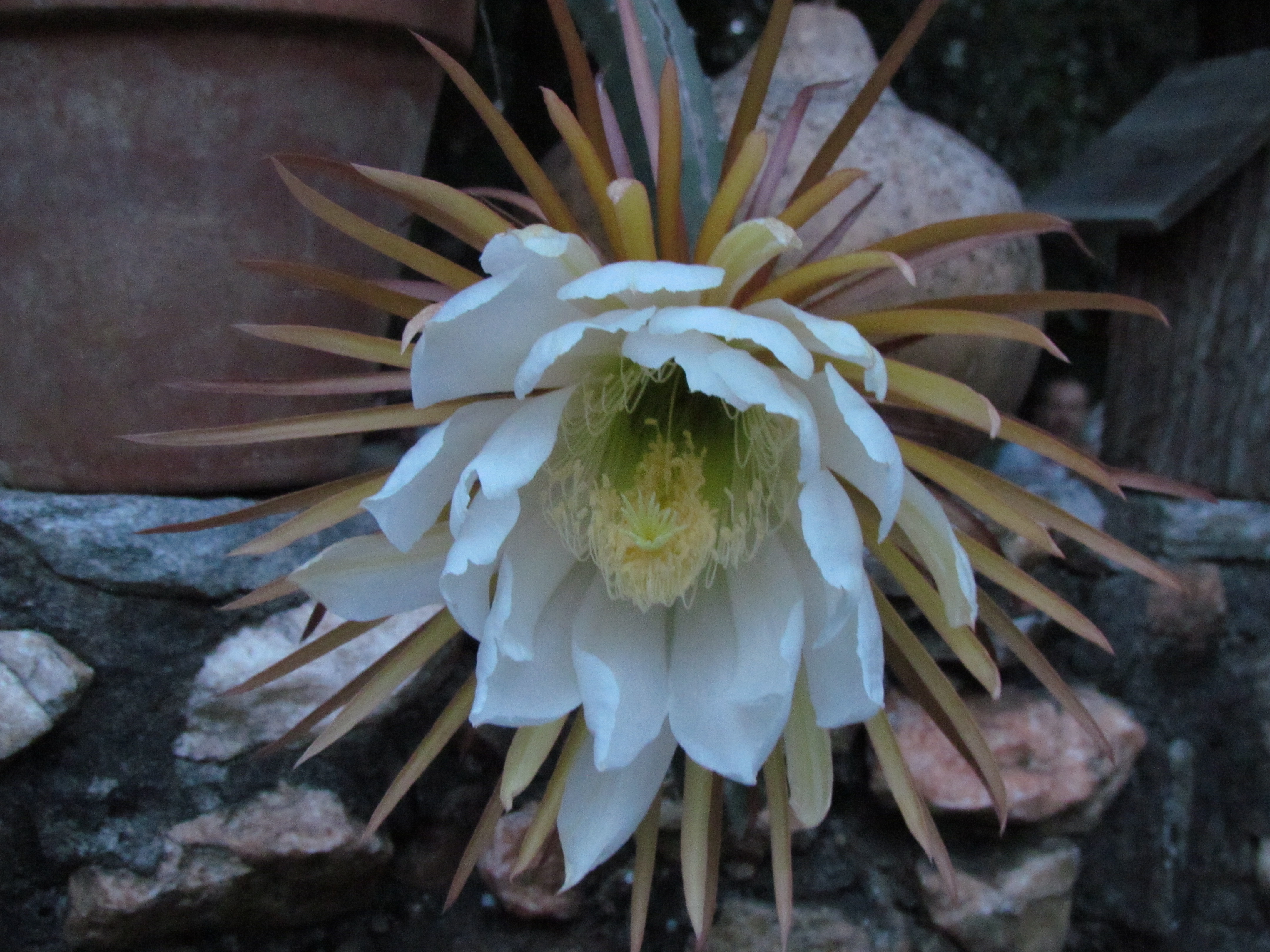 Tonight, while stopping by for a visit to the garden and to check on Jim and Peggy, we were greeted by the opening of the night blooming cactus, Selenicereus grandiflora or Queen of the Night! Emerging out of the side of the thin and rambling cactus has been an ever evolving shape. This shape initially started out as a bump of a wooly and downy feather looking mass and eventually grew into a bud with the appearance of a long tapering profile resembling a swan neck, head and beak. During the week, the neck portion of the bud grew to almost six inches and the outer rays surrounding the tight large bud started to expand. Just as dusk approached, the bud started to become “Queen of the Night.” The beak point of the bud opened to a small one inch diameter revealing the numerous inner stamens and stellar stigma inside. Within the next fifteen minutes, the bud became a crepuscular star with a huge ivory white corolla and yellow and mauve rays expanding out as the evening drew darker. This beautiful sight helped to usher in the almost full and waxing gibbous moon. As a matter of note, the flower was illuminated and faced the direction of the moon as it rose in the eastern sky. We did not detect any pollinators to the flower, but I have read that in their native environment of Central America, West Indies and Mexico, night-blooming cacti depend on bats for pollination.