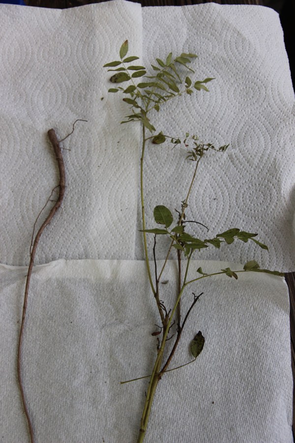 Glycyrrhiza glabra – licorice root (left) and stem leaf (right) just harvested from the Green Farmacy Garden
