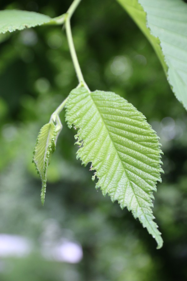 slippery elm leaf – note the serrated leaves and the uneven leaf base