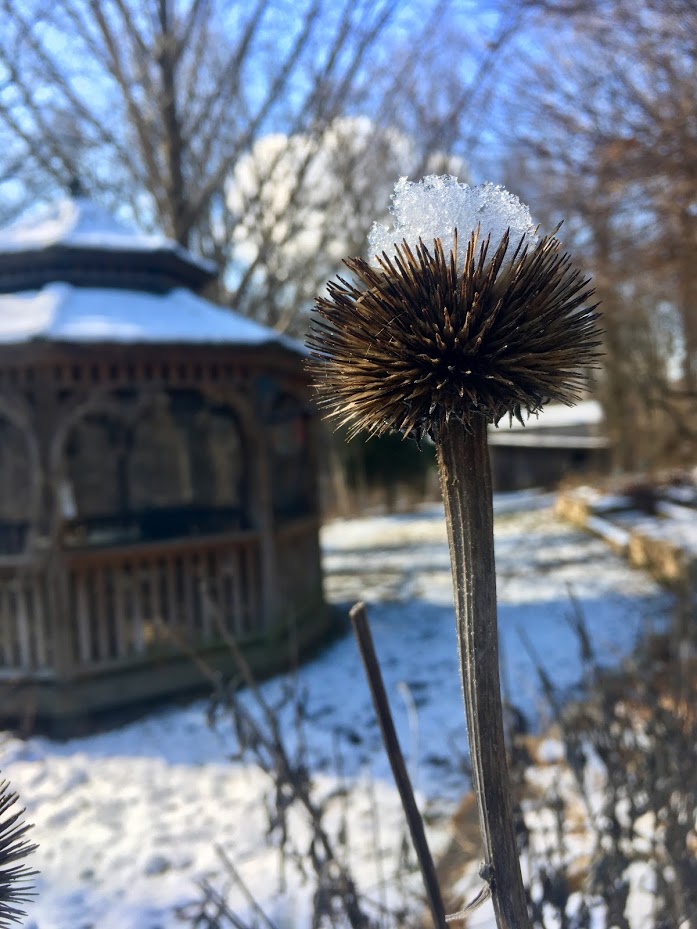 Snow-capped Echinacea and gazebo