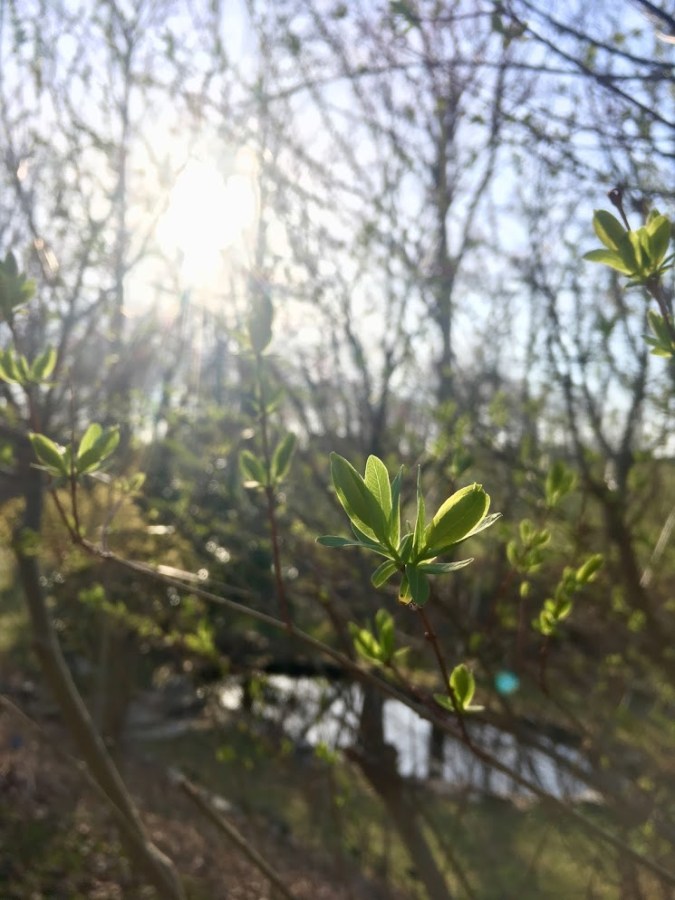 Salix integra new gem leaves sunning, o’er looking the pond*<3 : variagated dappled willow new leaves