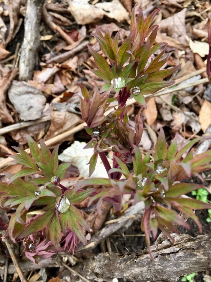 Paeonia suffruticosa baby leaves dappled with glistening rain droplets : tree peony