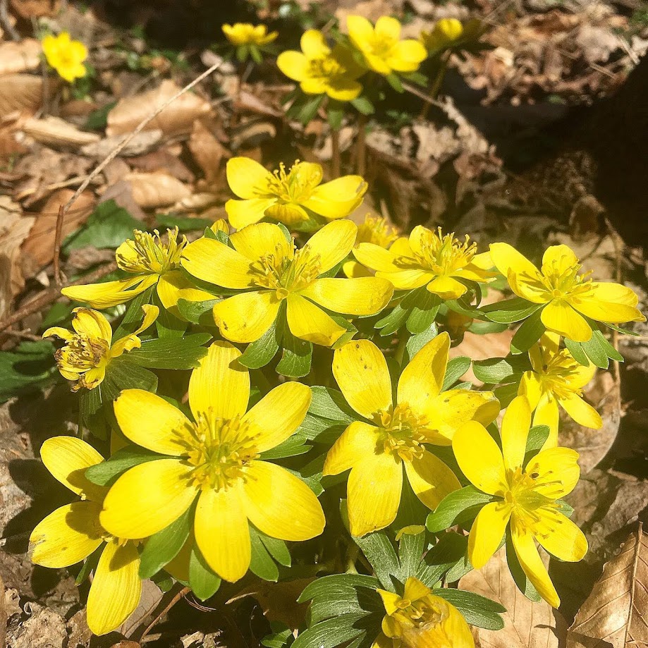 In the woods we were delighted to find the dazzling winter aconites brightening up the brown landscape down by the creek.