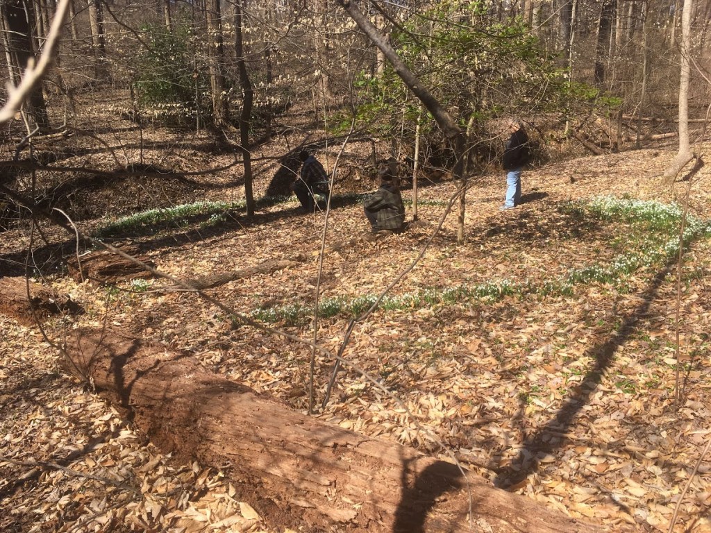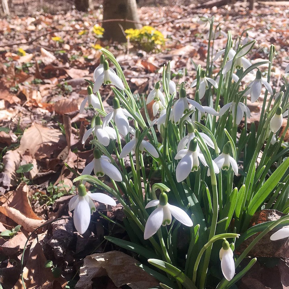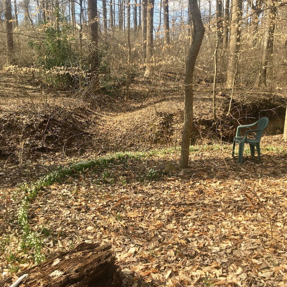 half of the snowdrop circle down in the woods by the creek with Jim’s old thinking chair