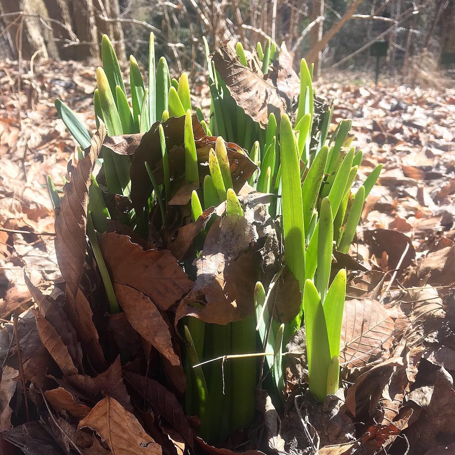 Narcissus bursting into spring through the leaf litter, daffodil shoots