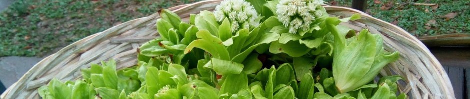 For 2 years I’ve observed the Giant Butterbur (Petasites japonicus) flourishing in the wooded edges surrounding the garden, having migrated there (I assume) by seed from the garden specimens. I soon learned that the buds and leaf stalks are consumed in Japan, but references to pre-processing steps, combined with my lack of familiarity with Japanese cuisine, beyond sushi and miso soup, intimidated me from attempting to eat it.