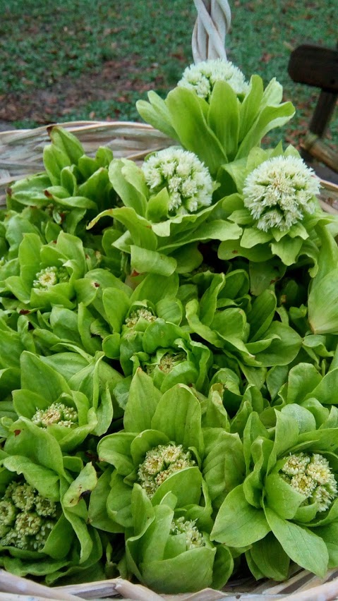 I had a hard time restraining myself when I finally got out to harvest, having developed momentum by researching and printing recipes, discovering the name of the bitterness-removing process (aku-nuki), and having reason to believe it may not even be necessary for the fukinoto. Harvesting from just one of the property’s several stands of the Giant Sweet Coltsfoot (another English common name for the plant), I managed to fill my basket in about half an hour, skipping the majority of buds, which were slightly more mature (though, in the shade of the woods where I harvested, most were not as mature as the fully open blooms I selected from the sunny garden bed to accent my photo) than those I took.