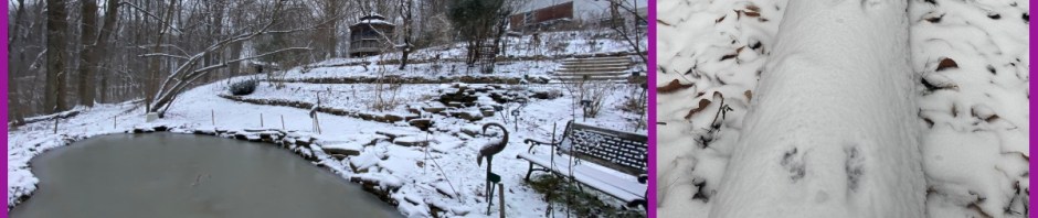 Above, clockwise from top left: frozen pond; critter footprints (do you know whose?) in the woods; the barn; the patio in the wondrous white.