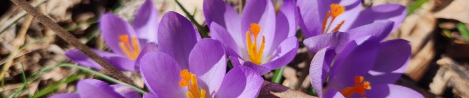 Images from the woods below, clockwise from top left and right, respectively: purple and gold crocus (Crocus sp.); a honeybee (Apis mellifera) positively glows, covered in Snowdrop (Galanthus nivalis) pollen; Winter Aconite (Eranthis hyemalis).