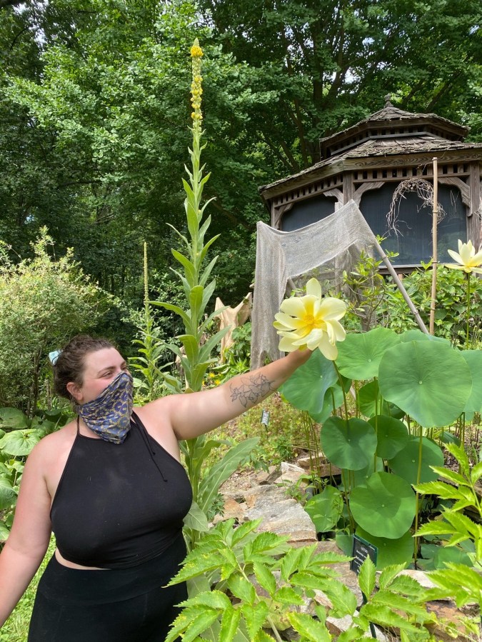 Michelle with Lotus flower at the small Lotus Pond, 2020