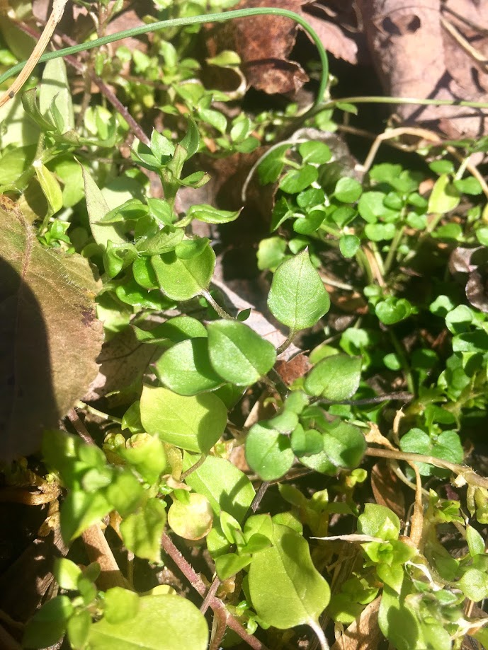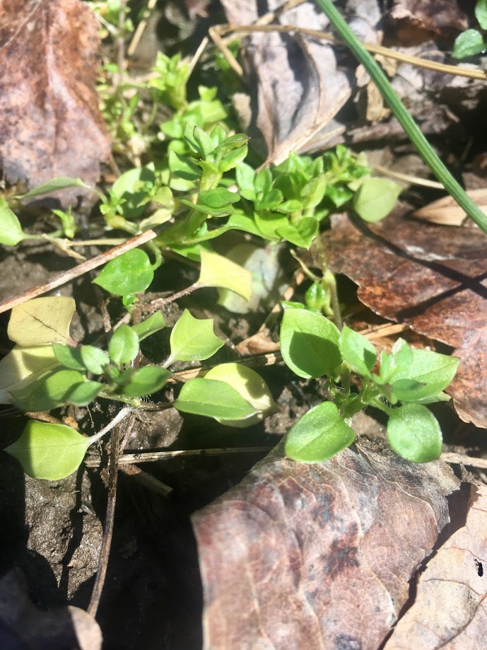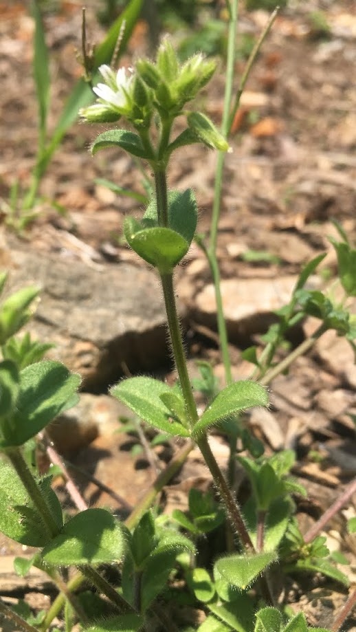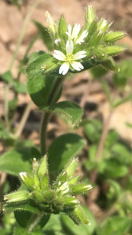 Stellaria media is a mat-forming perennial ground cover. It blooms from early to mid spring with teeny white flowers at the ends of the plant’s stems. The flowers appear to have 10 petals, but are really 5-petals that are deeply divided. The leaves are opposite, toothless & stalkless (no petiole). The stems can be erect but typically sprawl along the ground, rooting at nodes.